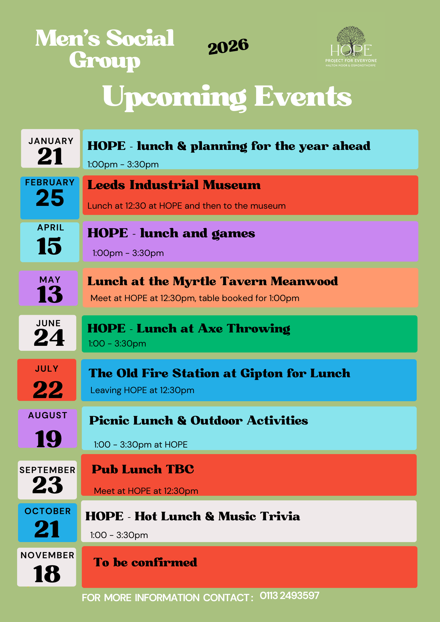 We offer a varied programme of activities that provide a wonderful opportunity to meet people, socialise and build friendships and networks. Throughout the year, HOPE organises several day trips/outings.